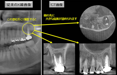 | 従来の歯科治療ではX線写真による2次元的な平面での診断しかできませんでしたが、歯科用CTの登場により、3次元の立体画像での精密で高度な診断が可能になりました。 |