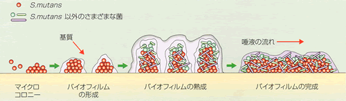 | 細菌バイオフィルムとは「多種多様の細菌が複雑にからみあってきわめて安定した集落を作り、一種の共棲関係にあるような状態」をいいます。このフィルムは、細菌が分泌する多糖体に守られ、強力に付着するため、歯ブラシではなかなか取り除くことができません。また、他の異物の侵入を拒否する性質があるため、塗り薬やうがい薬などの効果も限定的です。 |
