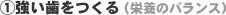| 歯のためによい、カルシウムやその他栄養バランスのとれた食事にする。噛みごたえのある食べ物を多くします。 |