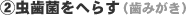 | 歯が生えたら、すぐ歯ブラシに慣れるようにします。 また食事のあとは、できるだけ歯をみがくようにしましよう。自分で歯をみがくようになったら、最初はお母さんが仕上げみがきを手伝います。 |